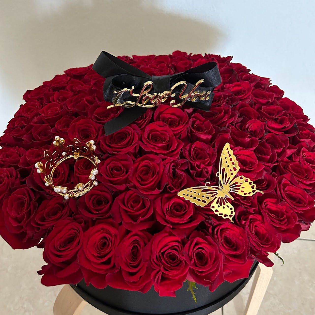 Español Disfruta de la elegancia atemporal con nuestra Love Box un espectacular arreglo de más de 100 rosas lujosas envueltas en seda negra de primera calidad. Cada flor está cuidadosamente seleccionada y personalizada con detalles decorativos únicos, creando una declaración inolvidable de afecto. Perfecta para aniversarios, propuestas o celebrar tus momentos más especiales. Esta presentación sofisticada transforma un gesto simple en una experiencia extraordinaria.