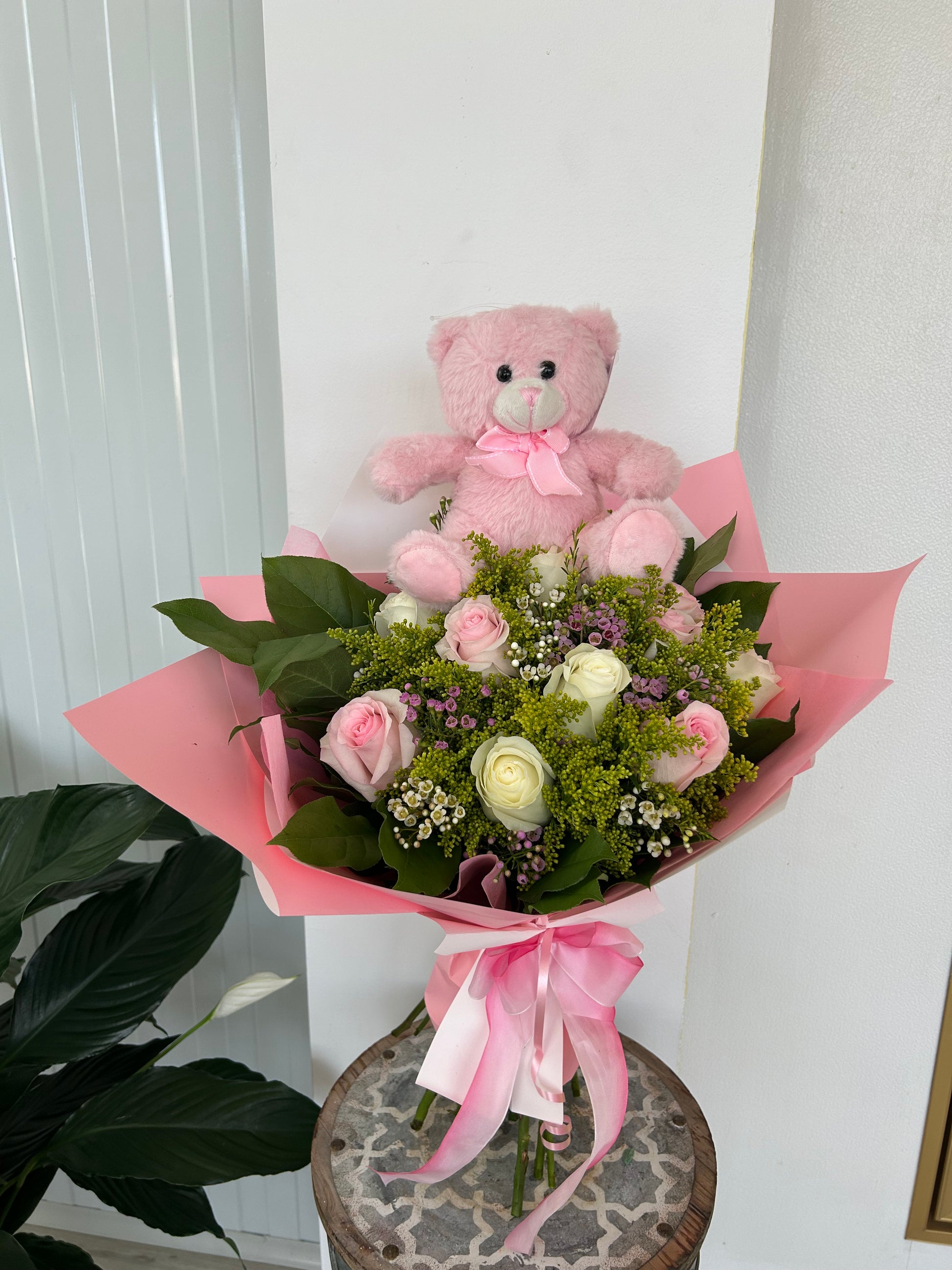 Recibe la llegada de una vida preciosa con elegancia discreta. Este envoltorio cuidadosamente diseñado combina rosas delicadas con un oso de peluche suave, envuelto en papel especial coreano de primera calidad con detalles específicos para la ocasión. Un gesto sofisticado que captura la ternura y alegría de este momento trascendental, diseñado para dejar una impresión duradera.